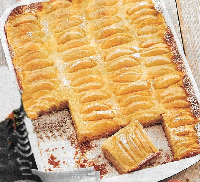 Jetzt wird der abgekühlte Pudding vorsichtig darauf verteilt und glatt gestrichen. Die Apfelspalten werden gleichmäßig darauf gelegt und der Kuchen wird in der Ofenmitte ca. 50 Minuten goldgelb gebacken. Gegebenenfalls den Kuchen mit Backpapier abdecken oder die Temperatur zum Schluss ein klein wenig runter drehen, damit er nicht verbrennt.