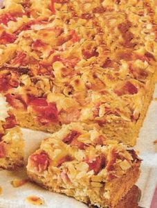 Den Teig habe ich auf das Backblech gegeben, mit einem Tortenheber gleichmäßig auf dem Blech verteilt und die Rhabarberstücke gleichmäßig auf den Teig gegeben. Zum Schluss die gehobelten Mandeln darüber gestreut und im Ofen auf der mittleren Schiene 45 Minuten gebacken. Danach habe ich ihn auf dem Rost vom Backofen abkühlen lassen.