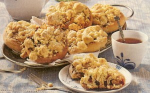 4. Den Teig von einer Längsseite aufrollen und in ca. 20 Schnecken (ca. 2 cm dick) schneiden. Auf die Bleche verteilen, etwas flach drücken. Streusel darauf verteilen. Blechweise im heißen Ofen (E-Herd: 200 °C/ Umluft: 175 °C) ca. 20 Minuten backen. Danach abkühlen lassen und mit Puderzucker bestäuben.
